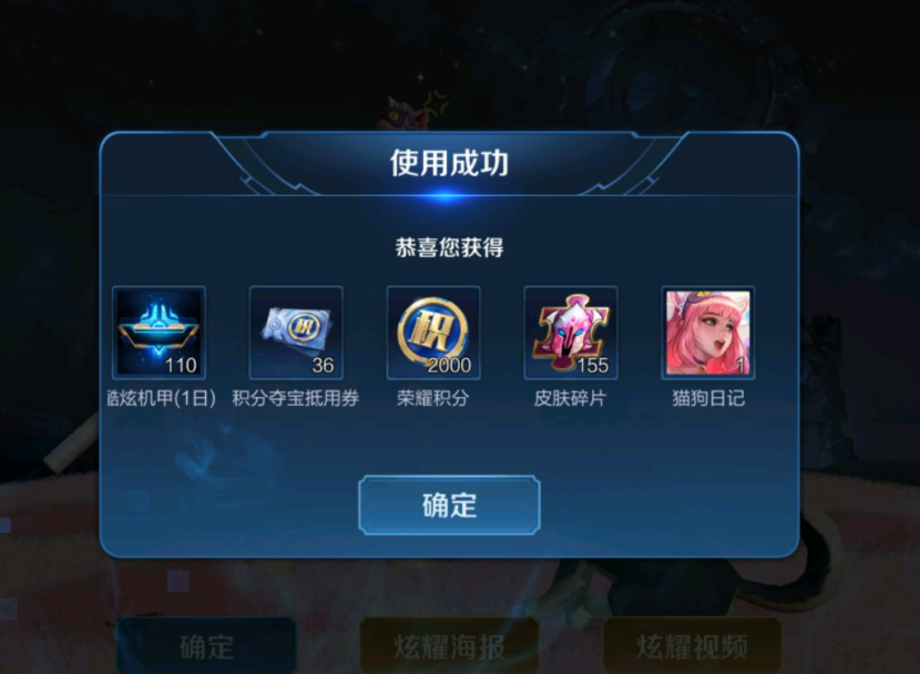 这110发下去必得了110个酷炫机甲,这个可以忽略了,而夺宝券有36张,荣耀积分2000份,皮肤碎片155个。